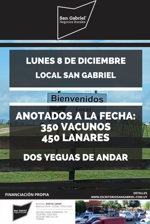 San Gabriel Negocios Rurales tiene su escritorio ubicado en el departamento de Florida. Cuenta con un equipo humano Joven y dinámico; realizando todo tipo de transacciones que comprenden, embarques a frigoríficos, venta de ganado, de campos, arrendamientos y capitalizaciones. Siempre dispuesto a escuchar, analizar y realizar todo tipo de negocios que se le plantea. Como base sólida de sus acciones cuenta con el local “San Gabriel” ubicado en Ruta 6 y 56.